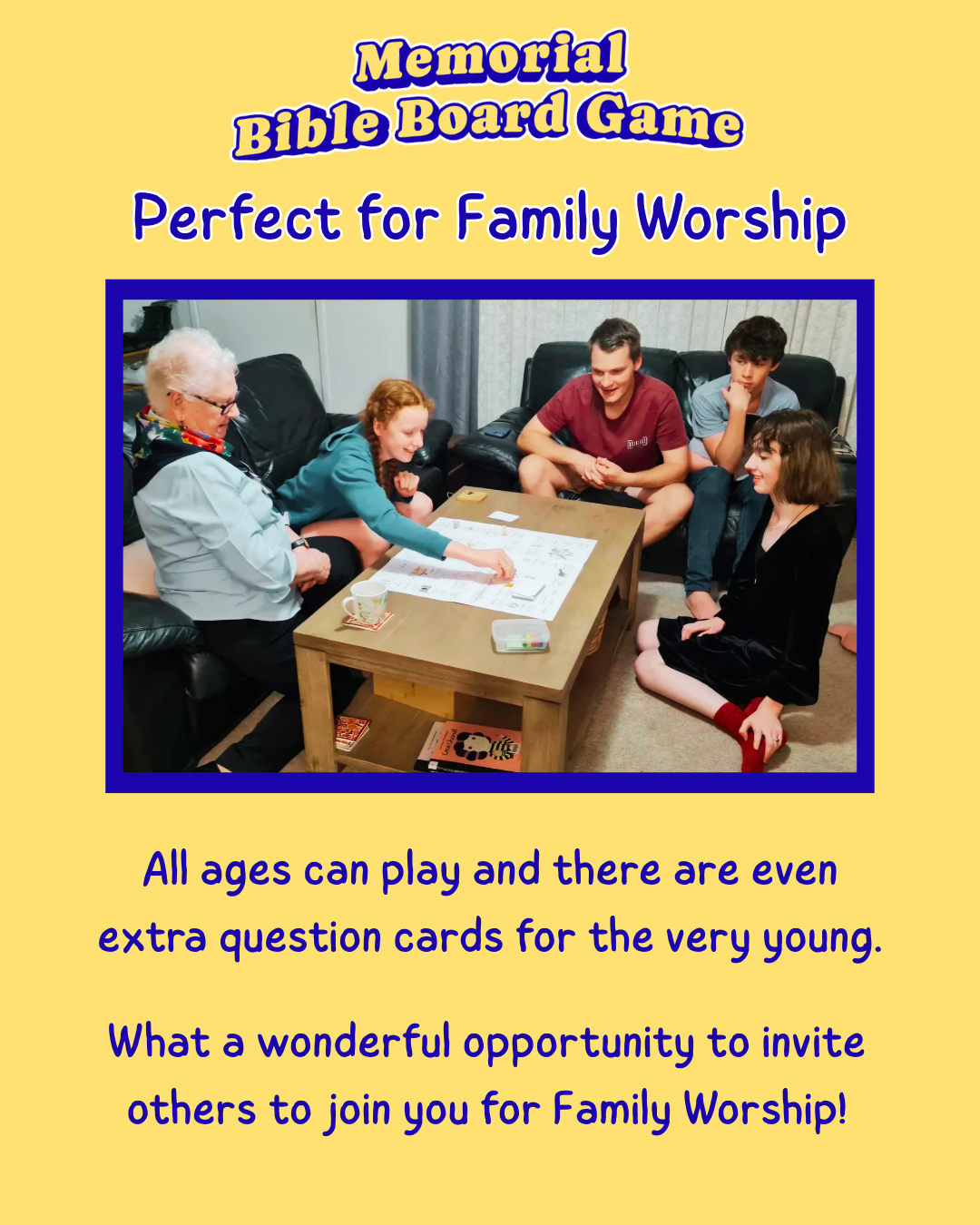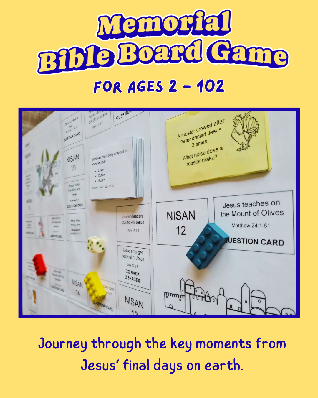 This Memorial Bible Game comes as a PDF that you download and print, which means you can play it on the same day you purchase it. Just cut out the question cards, and stick the board pieces together and you’ll be ready to play! Your children might even like to color in the pictures on the board. There are even special question cards for very young children so all can play.