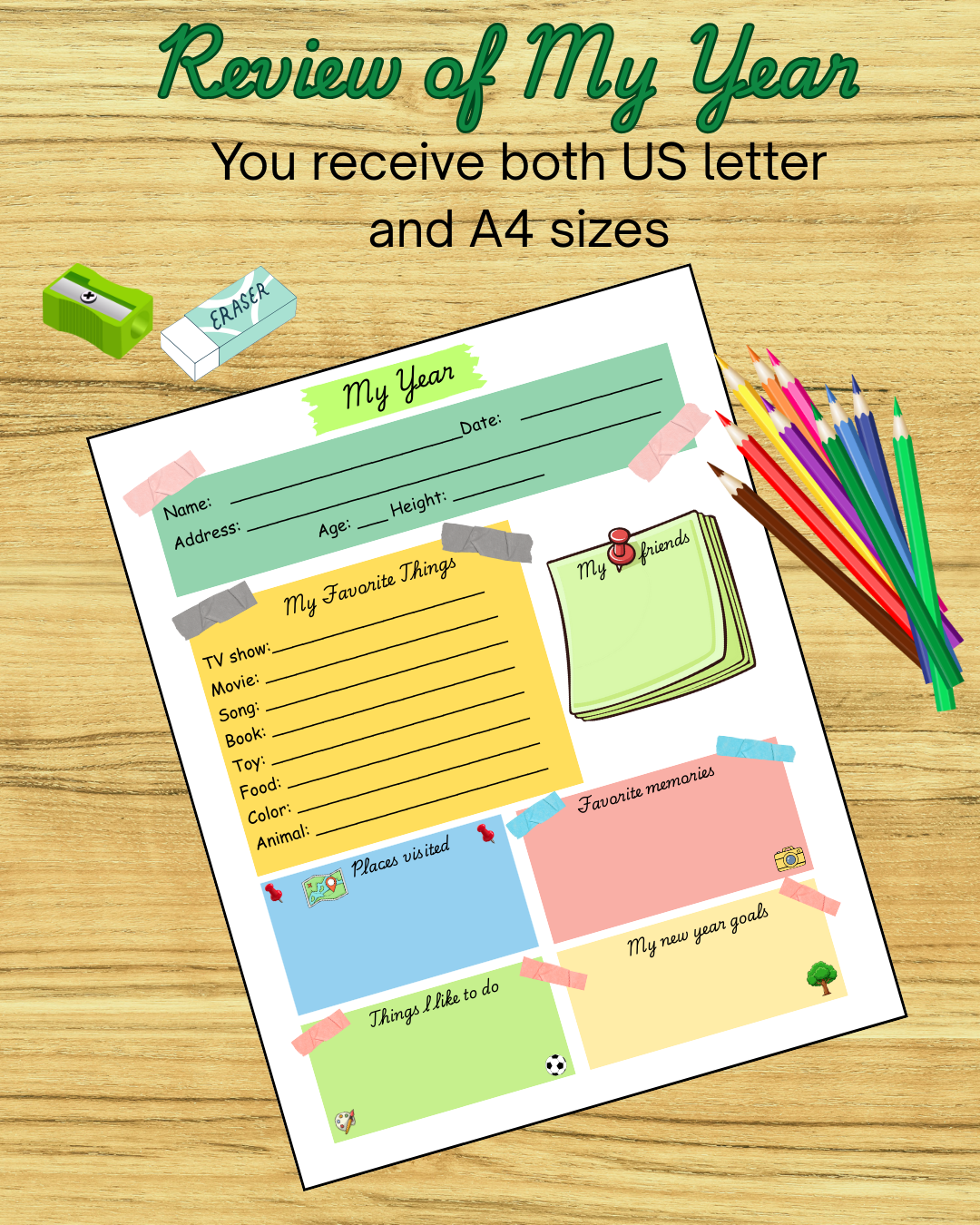 Don't let the precious memories fade. This is a fun activity sheet for your child to fill out and reflect on their year.