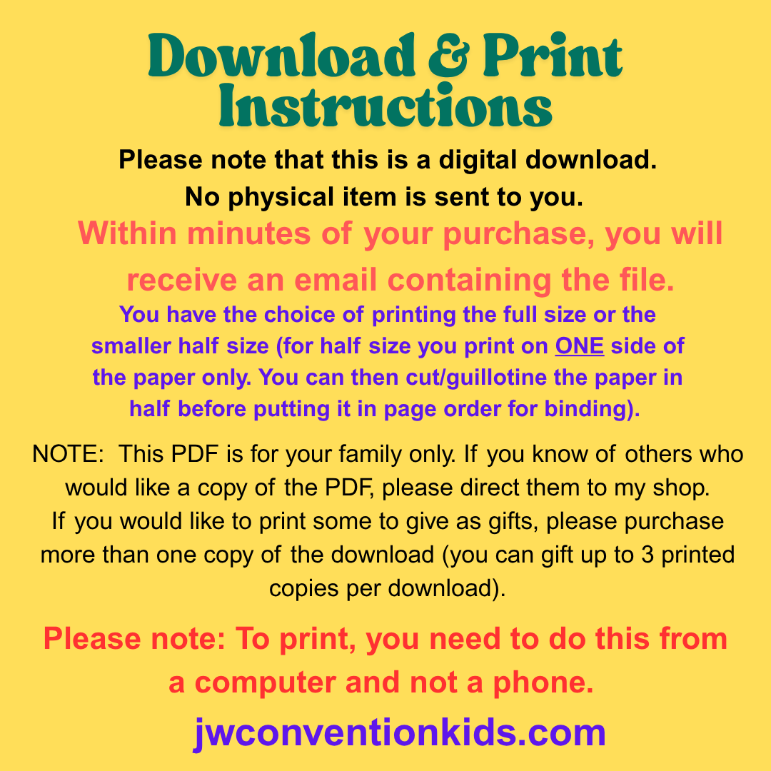 ¿Buscas algo para que tu hijo siga con alegría el programa de la Asamblea? No busques más. Estas páginas están repletas de actividades bíblicas apropiadas para cada edad, para cada charla. Son especialmente útiles para las Asambleas de un día, ya que los días pueden parecer mucho más largos al no mostrar videos.